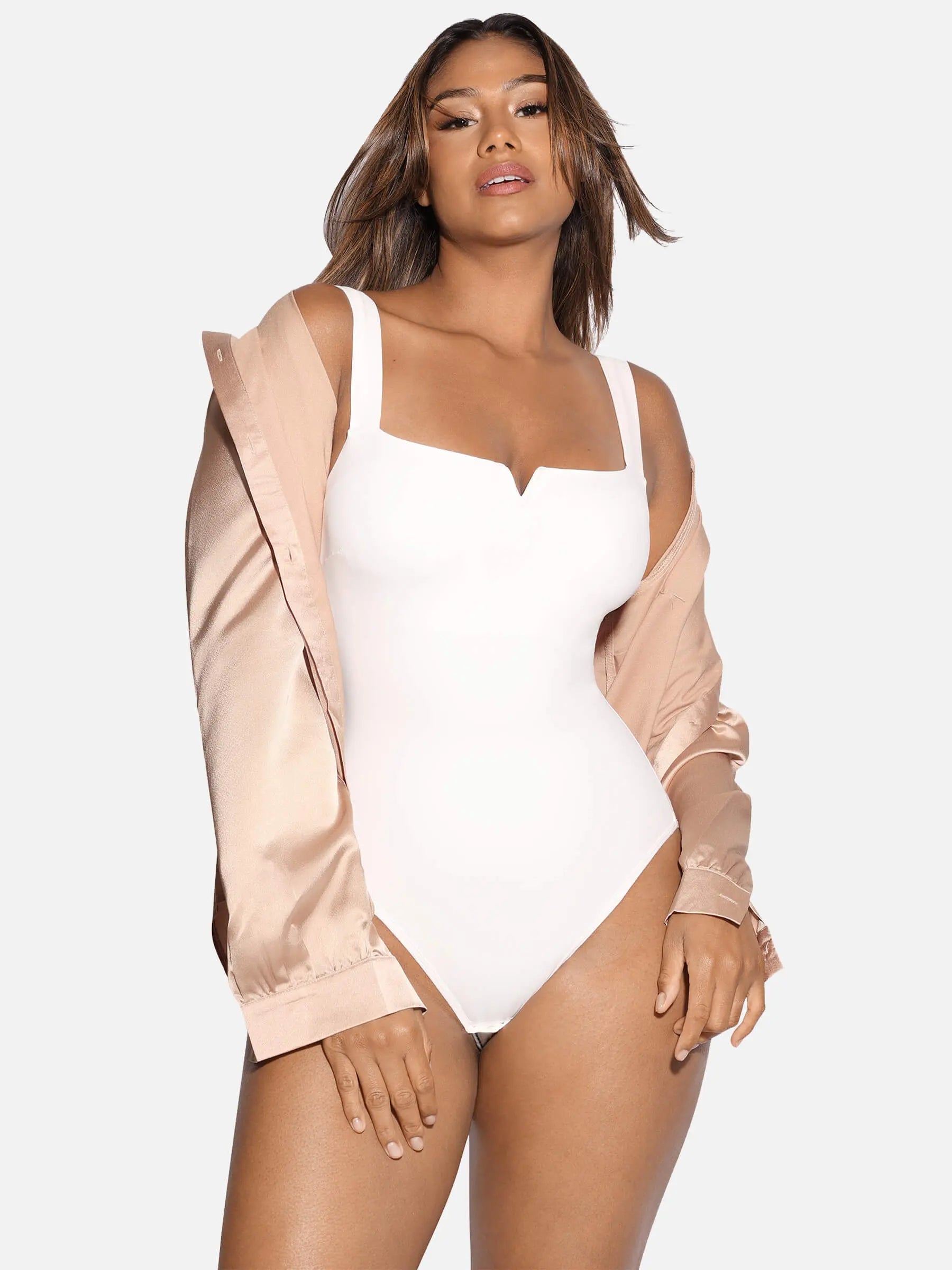 • Elastisch breisel: Vormt een mouwloze bodysuit met brede bandjes en een vierkante halslijn voorzien van een subtiele inkeping (ondersteund door een interne U-beugel).